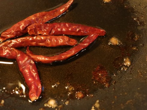 Peppers cooking in sesame oil. Add as many as you want to reach the desired level of heat. These will eventually turn black–that’s when you add the rest of the ingredients.