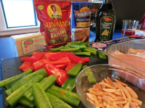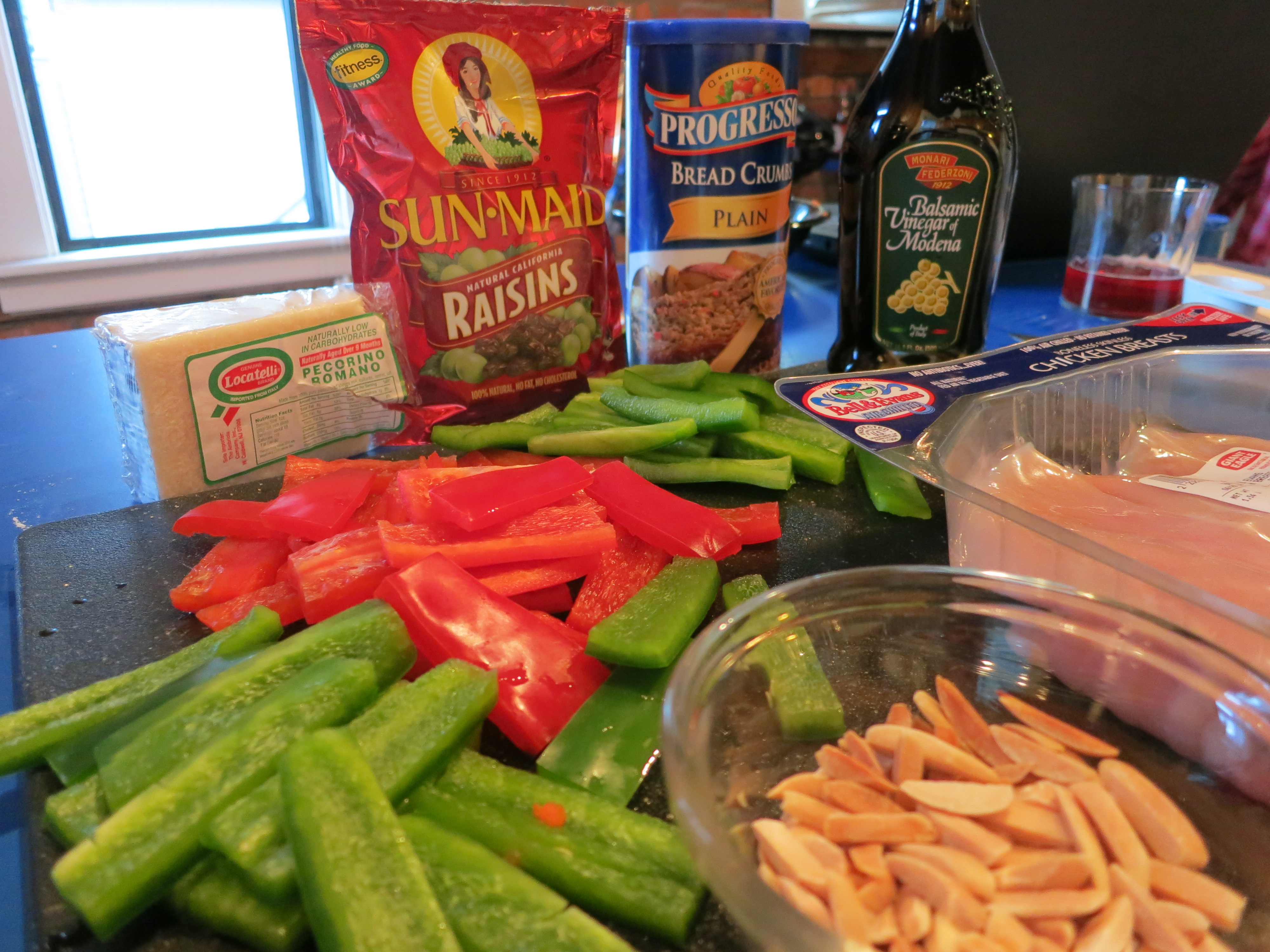 Originally taken from Cooking Light (I think), this recipe has become a reliable component of my cooking repertoire. The blend of sweet and salty stemming from the combination of peppers, raisins, toasted almonds, and balsamic vinegar make this a recipe that covers all of its flavor bases. Add to that the flavor complexity provided by the Parmesan cheese in the breading on the chicken, and the result is a recipe that is sure to please. As should be obvious, this isn’t an especially fancy or gourmet recipe. But does that really matter when it tastes good?