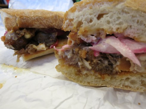 But. Back to the sandwiches. For my money (and they’ve gotten plenty of it), the best sandwich on the menu is the Chicharrón Peruano. A classic Peruvian sandwich, the Chicharrón Peruano consists of pork shoulder that has been cooked slowly and in such a way that it actually ends up frying in its own fat. The result is a meat that is crispy and can be quite crunchy on the outside while remaining tender and juicy on the inside. The sandwich is then topped with salsa criolla. Salsa criolla is best described as an onion relish, and it’s found in numerous Peruvian dishes. (For those of you afraid of the ceviche as described above, try the salsa criolla. While not the same, the flavors are similar enough to give you an idea of what you’re missing.) It’s generally prepared by marinating red onions in a combination of lime juice and vinegar. The result is a delightfully tangy flavor that helps balance out the richness of the pork. Si Señor puts its own twist on the traditional combination of pork and salsa criolla by dressing the sandwich with a sweet potato mayo.