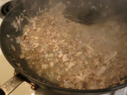 4. Drain enough chicken fat so that only about 2 tablespoons of fat remain in the. Add the onion, garlic and mushrooms; cook over high heat, stirring frequently, for about 3 minutes. Sprinkle the remaining 1/4 teaspoon salt and 1/4 teaspoon pepper over the mixture.  Add the wine and cook over high heat for about 1 minute or until the liquid is reduced.