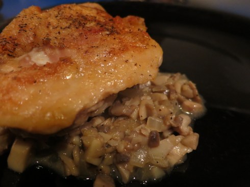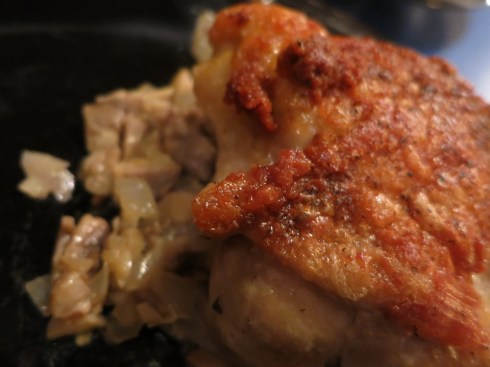 The chicken itself is only half of the equation however.  The recipe also features a sautéed combination of mushrooms, onions, and garlic, which serve as a flavorful podium on which your golden chicken thighs will sit.  Cooked in a small amount of chicken fat, and then wine which is reduced to a thicker sauce, the savory blend truly rounds out and completes the dish.  It’s what takes it to a level that’s far above average—it makes it blog worthy!
