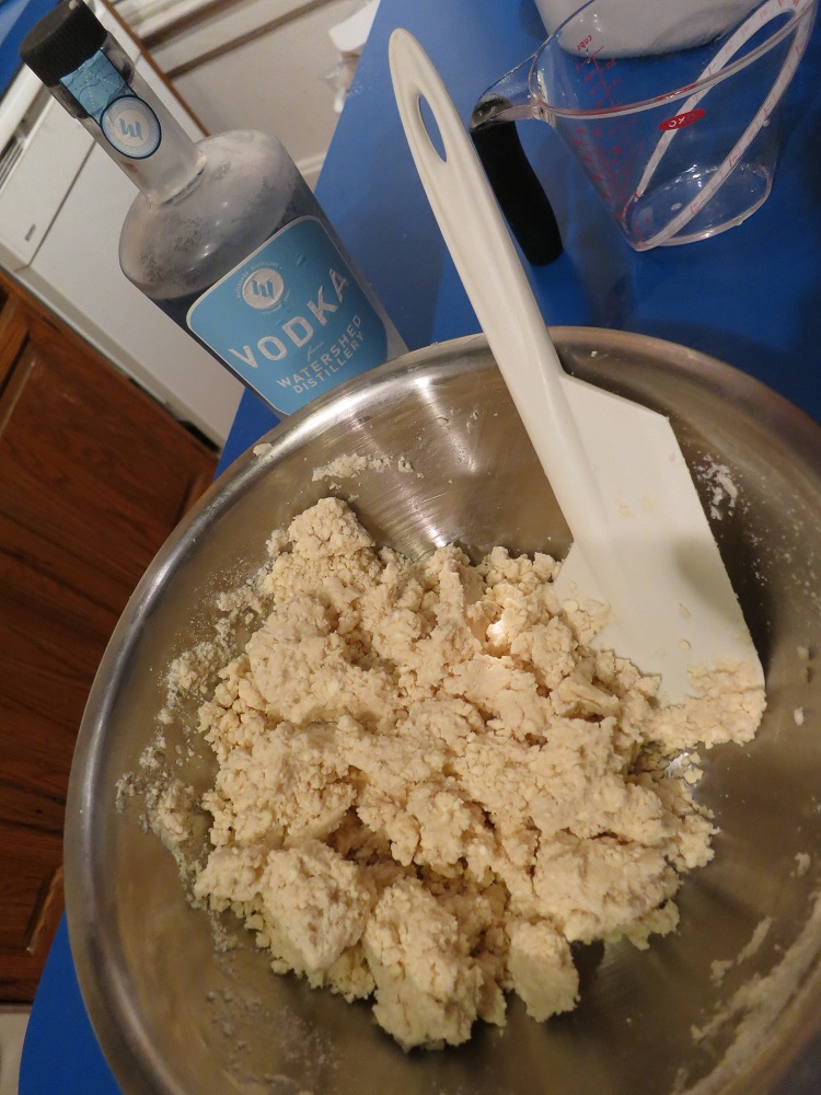 3. Sprinkle vodka and water over mixture. With rubber spatula, use folding motion to mix, pressing down on dough until dough is slightly tacky and sticks together.  (It’s possible, and will be tempting, to use the food processor to add the liquid to your dough.  After all, that’s one less dish to wash.  Don’t do it.  Adding the vodka and water manually will actually lead to a more tender flakier crust.)