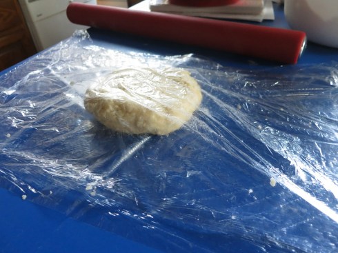 Because of the additional liquid in this recipe it is VERY sticky.  Sufficiently so that it’s going to stick to your counter and rolling pin if you don’t do something about it.  Some would say that you should combat this by making sure to roll it out on a well-floured surface.  I have a different suggestion: plastic wrap.