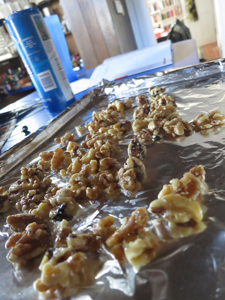 For this recipe, you can use whatever nuts you have handy. I had some walnuts, so that’s what I chose. When they were done, it was hard to keep from eating them all straight away. They tasted like hot, delicious buttered popcorn.