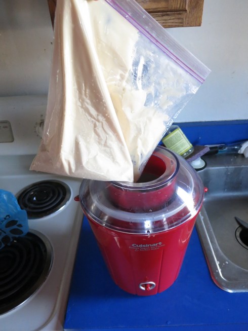 1. Cut off a corner of the Ziploc bag and pour into spinning frozen canister.