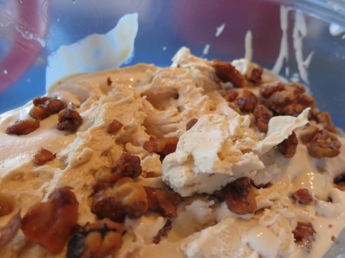 The recipe I settled on was Maple Ice Cream with Salty Buttered Nuts. One of the awesome things about Jeni’s cookbook is that whenever it includes ice cream recipes that calls for mix-ins, it has a recipe for those mix-ins as well. So if you want to make macaron ice cream sandwiches, there is a recipe for macrons. The same goes for gooey butter cake, brown butter almond brittle, and a variety of delicious sauces.