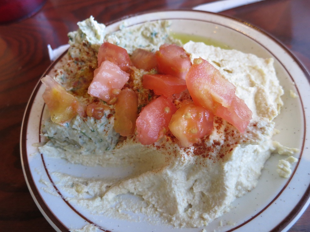 It was lunchtime, and lunchtime means sandwiches.  Amusingly enough, Tania and I opted for the same thing: the spicy chicken shawarma.  Great minds think alike.  Having not been to Nazareth before, I was completely unaware that their sandwiches are monstrous.  Therefore, I convinced Tania that we needed to also order a hoummus/baba ghannoug appetizer to split. And I ordered a greek salad as well.