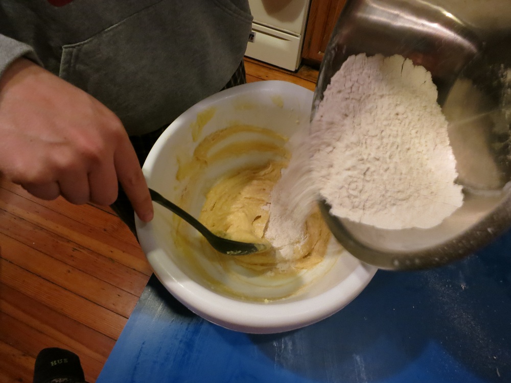 Slowly adding the flour to the shortening, sugar, egg yolks, and honey. Featuring two of the three bowls that this recipe dirties.