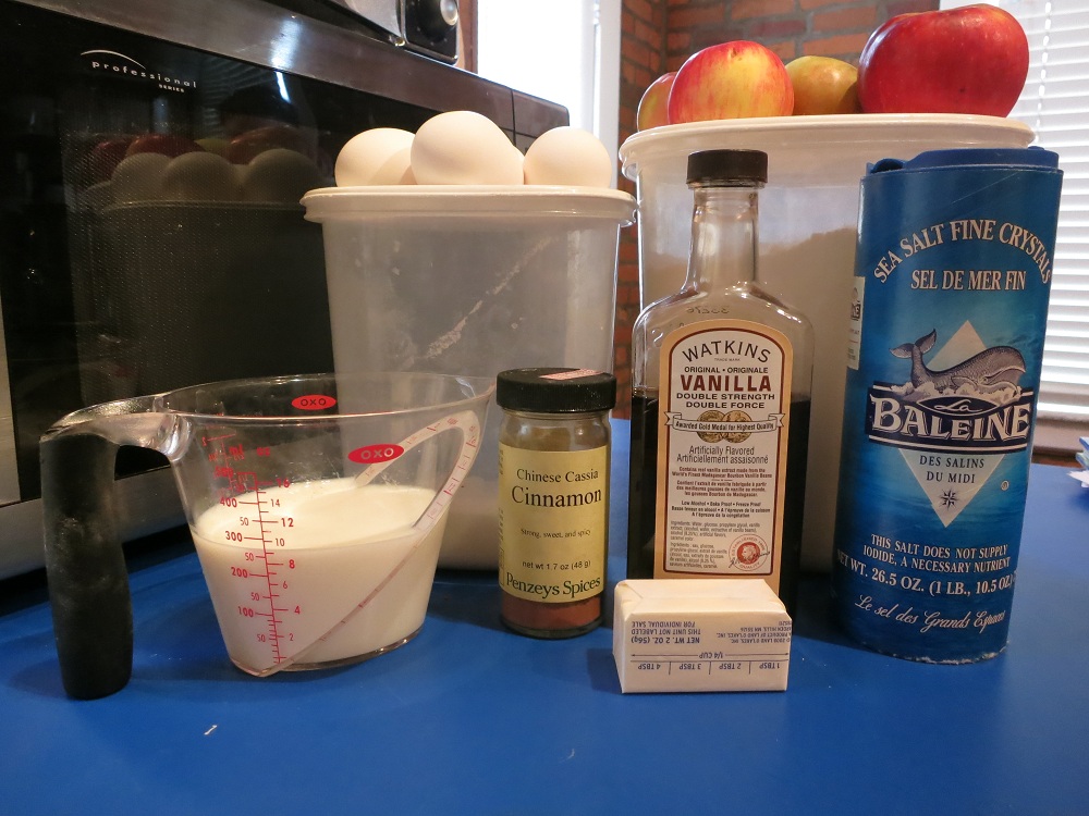 2. Beat the eggs until frothy.  Add the milk, flour, sugar, salt, vanilla, salt and cinnamon.