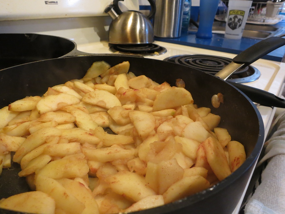 The foregoing recipe will get you the pancake part.  But, as you’ll see, there are no apples called for.  That’s because they go on top.  So while the pancake is baking, slice up a bunch of apples and sauté them in a pan with lots of (brown) sugar and cinnamon.