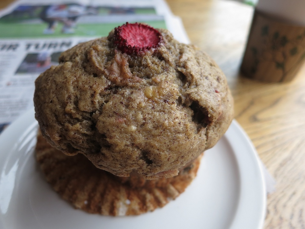 I of course got the recommended chilaquiles—with chorizio. (See earlier comment about my savory tooth.) But they also had muffins with interesting flavor combinations, which I also felt compelled to try. I ended up with a banana Mexican chocolate, with strawberries.