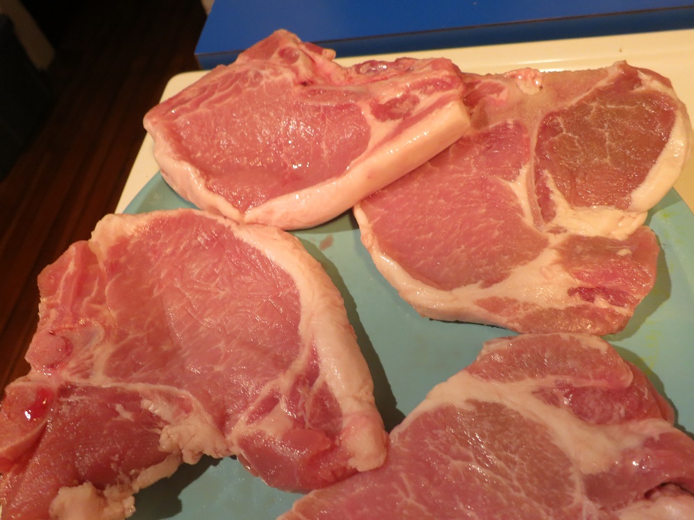 My first thought was that these chops would be perfect for frying.  Being thin, you wouldn’t need as much oil to fry them, and it’d be easy to do in my shallow cast iron skillet.  My second thought was: Tania eats way more healthfully than I do, so unless I wanted to fry up a mess of chops all for myself I’d have to 1) find at least some  other ways to prepare them and 2) find someone to eat fried pork chops with me at a later date.