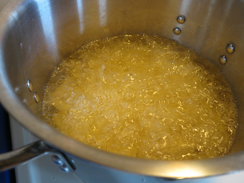 The fries bubbling away. We cooked ours over higher heat than most recipes online called for. They turned out great and took less time than was described in other recipes.