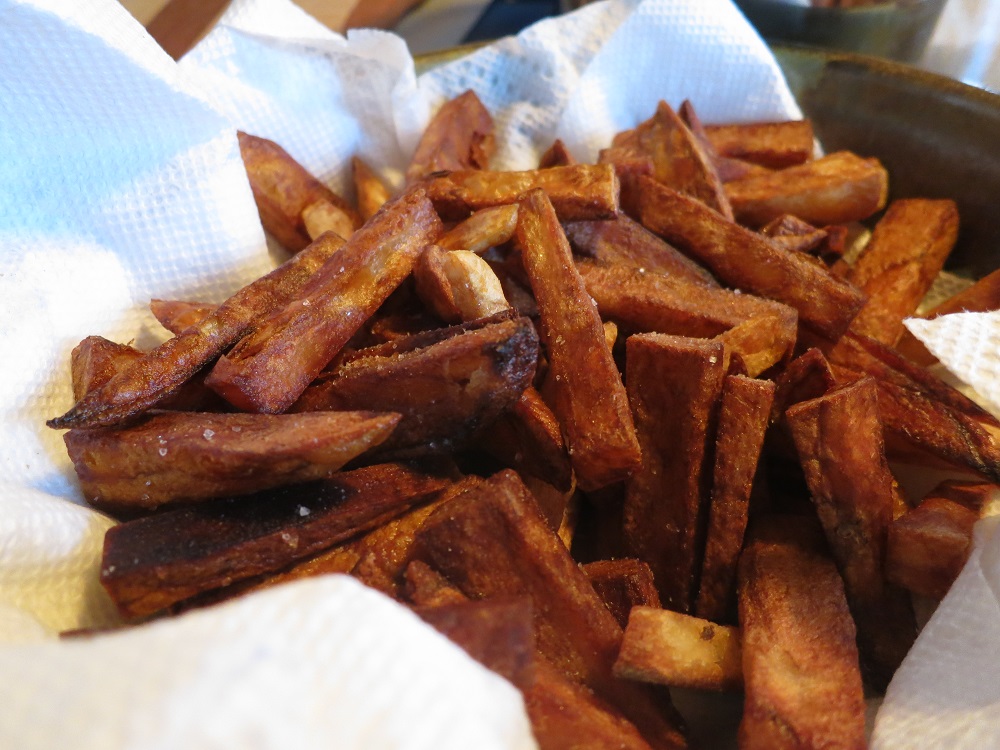Peppers taken care of, it was time to confront another issue posed by the lomo saltado recipe. It requires french fries—and I had never made them before. I’m sure it would be possible to use frozen ones and just bake them. But we were going all out and didn’t want to take short cuts. I did some research and discovered the somewhat counterintuitive technique of frying in cold/room temperature oil.