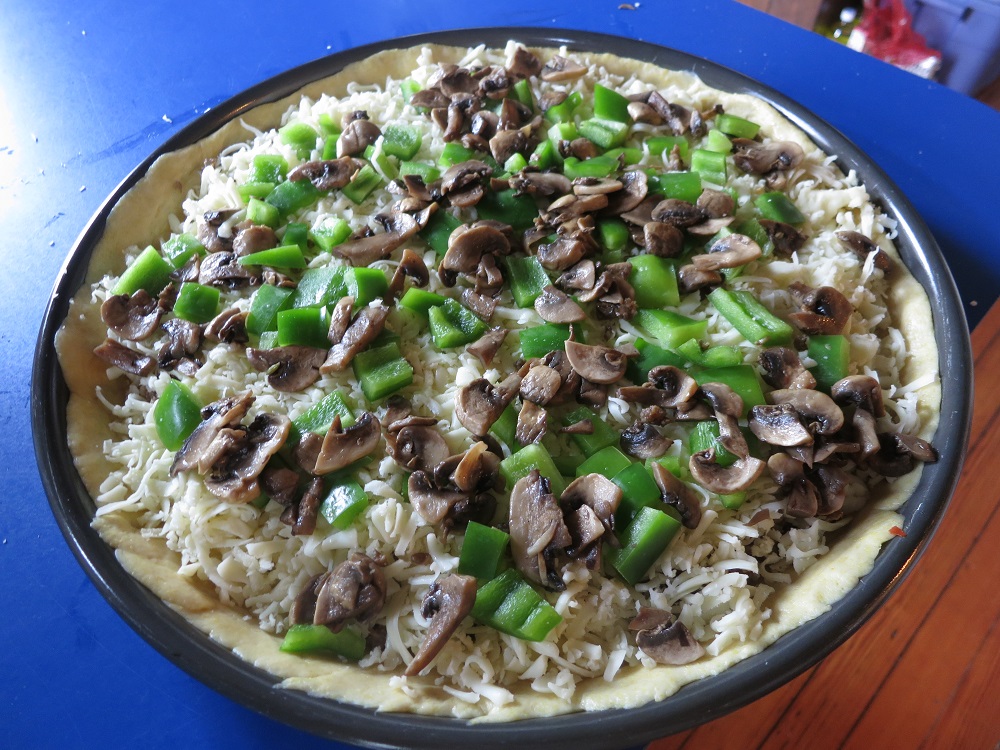 Mushrooms and green pepper on top of the cheese, sausage underneath. (Many people will tell you that the cheese must go on the bottom. Gino’s makes the sausage patty their first layer however, and while I can’t mimic the patty, I can at least follow the same order of construction.)